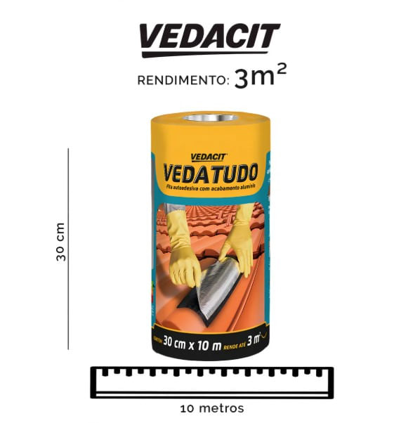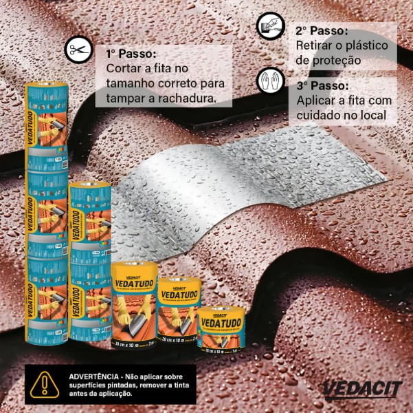 Cortar a fita VEDATUDO na medida desejada, retirar a película de proteção e aplicá-la sobre o local, pressionando com firmeza, principalmente nas bordas e extremidades. Recomenda-se que a sobreposição entre fitas seja de 3 a 5 cm.