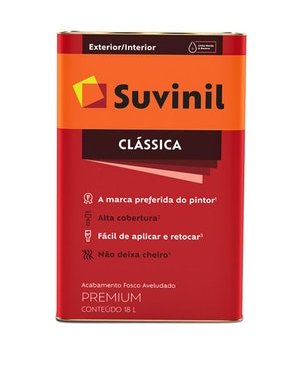 Com a tinta Suvinil Clássica não tem erro, é a nossa tinta mais tradicional. A marca preferida do pintor está no mercado há mais de 50 anos, pintando paredes com alta cobertura, fácil aplicação e retoque. A tinta com acabamento fosco aveludado que a sua casa merece. Pra completar, também não deixa cheiro. Suvinil Clássica é toda a tradição de Suvinil em uma só lata.