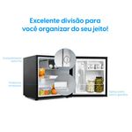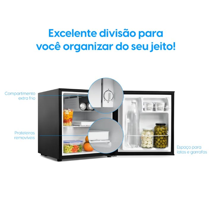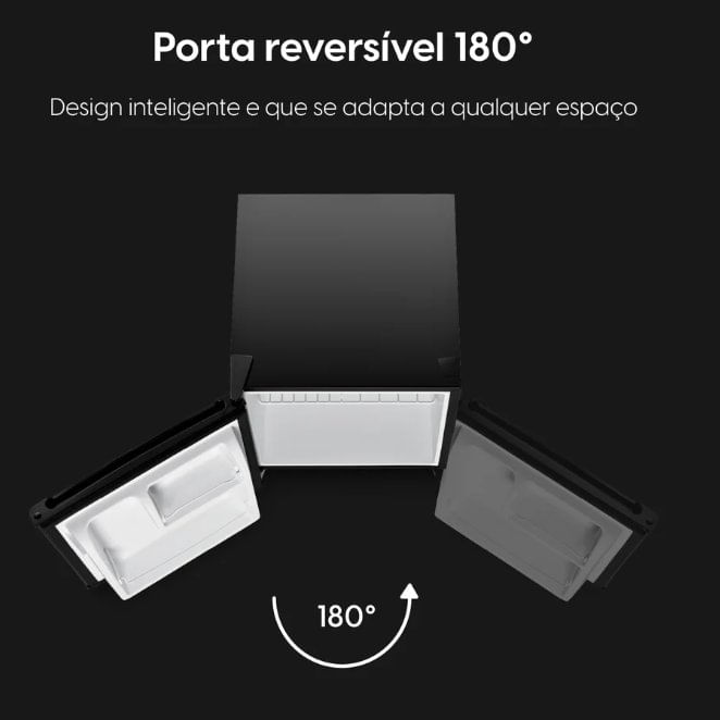 Frigobar com capacidade de 70 litros, ideal para armazenar bebidas e alimentos com praticidade e eficiência. Possui porta reversível com abertura de até 180°, permitindo adaptação a diferentes espaços e layouts.