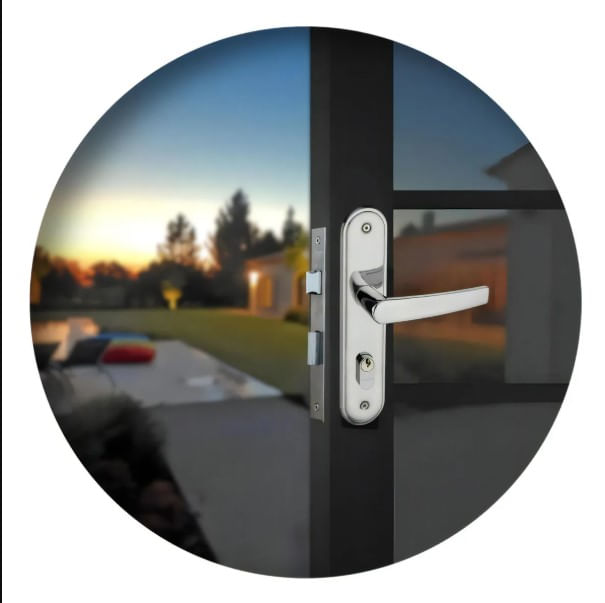 - Conta com maçaneta em zamac espelho testa e contra testa em aço inoxidável.
