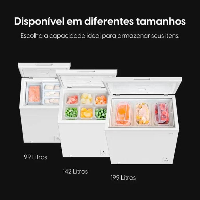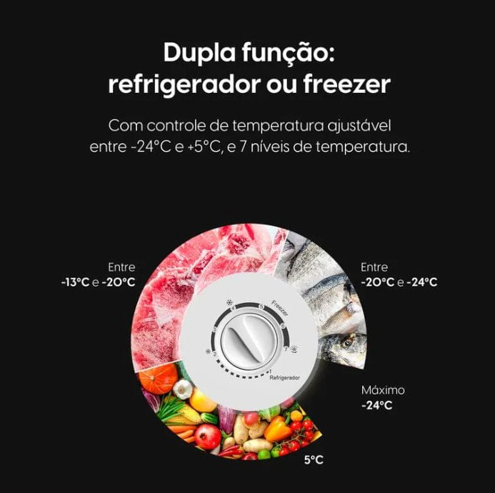 Adaptável ao seu espaço e à sua necessidade, oferece armazenamento inteligente e prático. O controle de temperatura varia de -24 °C a +5 °C, permitindo seu uso tanto como refrigerador quanto como congelador, possibilitando armazenar carnes, frios, bebidas e sorvetes.