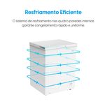 Conta com tecnologia de refrigeração 4D, que garante resfriamento rápido e uniforme por todos os lados. Utiliza gás ecológico R600a, livre de CFC, contribuindo para a preservação do meio ambiente, além de apresentar baixo consumo de energia, com classificação energética A pelo INMETRO.