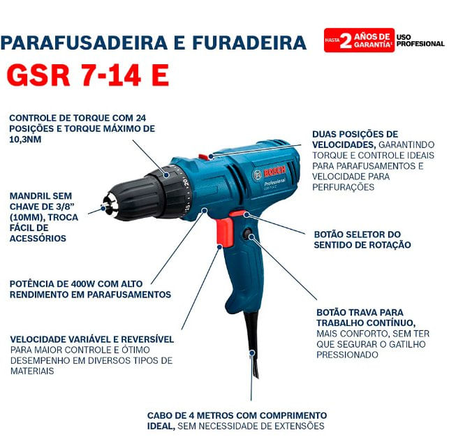 A Bosch GSR 7-14 E é a escolha ideal para profissionais que buscam robustez, controle e confiabilidade em uma parafusadeira a cabo, atendendo perfeitamente às demandas do dia a dia. Acompanha bolsa.