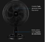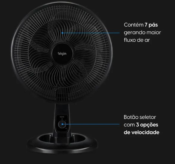 Equipado com 7 pás aerodinâmicas, oferece maior vazão de ar e desempenho superior em comparação a modelos convencionais. Conta com 3 velocidades, permitindo ajustar a intensidade do vento de acordo com a necessidade, desde uma ventilação suave até um resfriamento mais intenso.